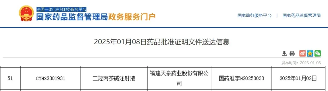近期,欧博abg生物科创成功助力福建天泉药业股份有限公司(以下简称“天泉药业”)申报的二羟丙茶碱注射液获批上市。